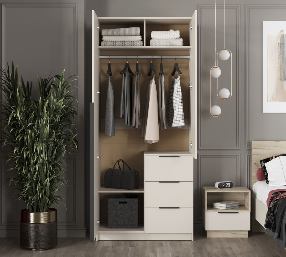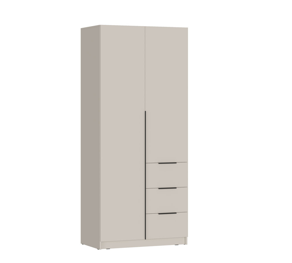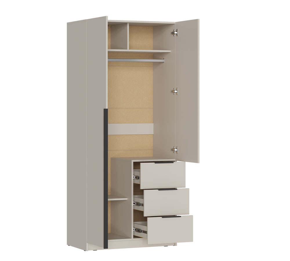 Левая створка и фасады ящиков оснащены черными пластиковыми ручками, а правая створка - без ручки, что добавляет минималистичный акцент.