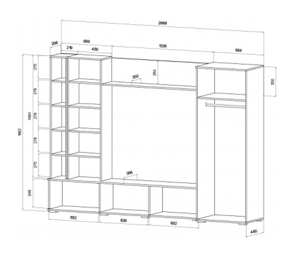 Габариты: 2669 Ш х 480 Г х 1862 В мм