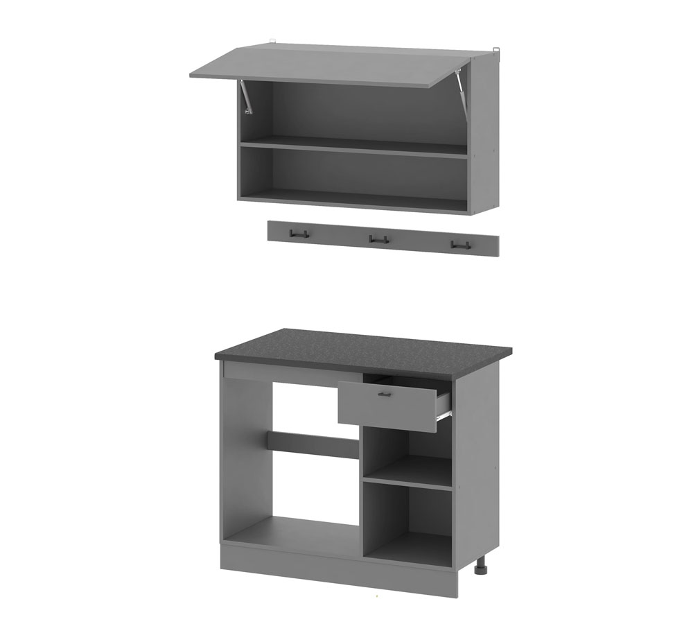 Кухня Энни 1,0 укомплектована независимой планкой графитового цвета, которая монтируется на рабочую стену. С обратной стороны планки выполнена наметка под три двухрожковых крючка.