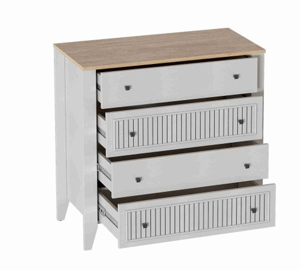 Комод с 4 ящиками Валенсия выполнен из (ЛДСП) в комбинации Дуб натуральный светлый / Персидский жемчуг.