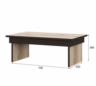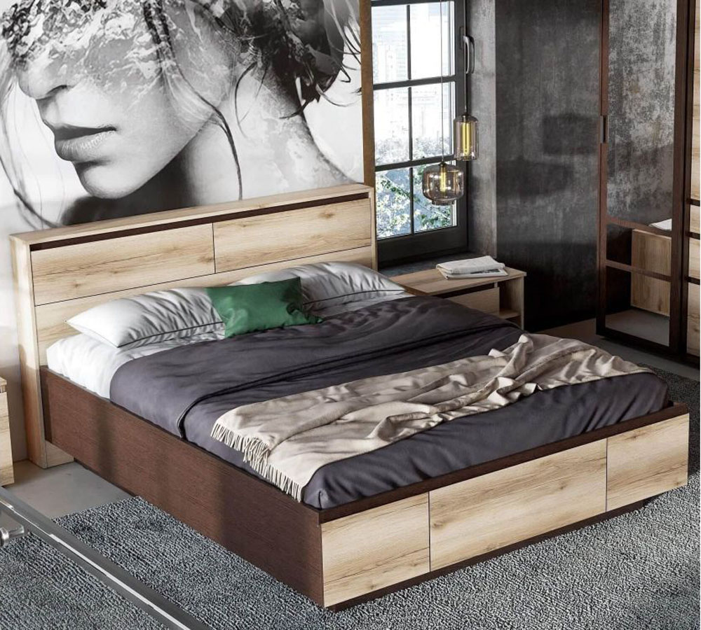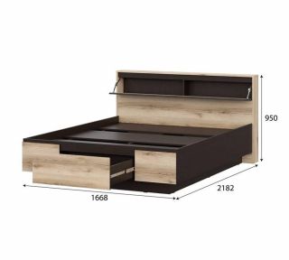Габарит (Ш*В*Г) 1668 х 950 х 2182 мм. в цвете Дуб Венге/Дуб Делано. Спальное место 1600*2000мм, матрас в комплект не входит. Кровать установлена на подиум, отступающий от нижнего щитка и боковых царг, создавая тем самым эффект парящей над полом кровати. Встроенный нижнем щитке кровати крупногабаритный выкатной ящик с интегрированной ручкой и усиленным дном. Массивное изголовье кровати, оснащенное двумя откидными створками, за которыми скрыты небольшие ниши для хранения необходимых мелочей. Уникальный столик для завтрака "Берген" в комплект к кровати для каждого покупателя.