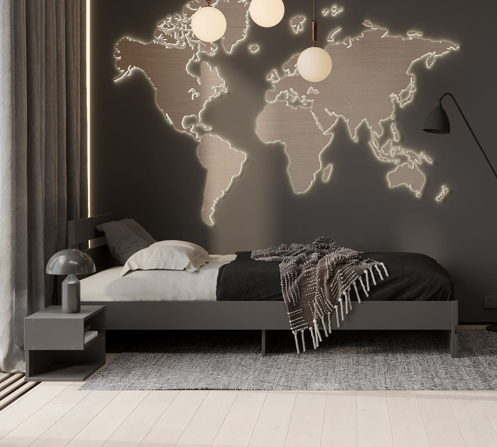 Решетчатое изголовье и нижний щиток, гарантирующие особую прочность и устойчивость. Жесткость этих визуально легких конструкций достигается вертикальными и горизонтальными вязками под основанием кроватей, вертикальными и горизонтальными опорами щитков. Царги кроватей расположены на высоте 15 см от пола, что позволяет проводить уборку под ними без особых хлопот. Настил и внутренние планки монтажа настила изготавливаются из технического ЛДСП, который может отличаться по декору от основного корпуса кровати