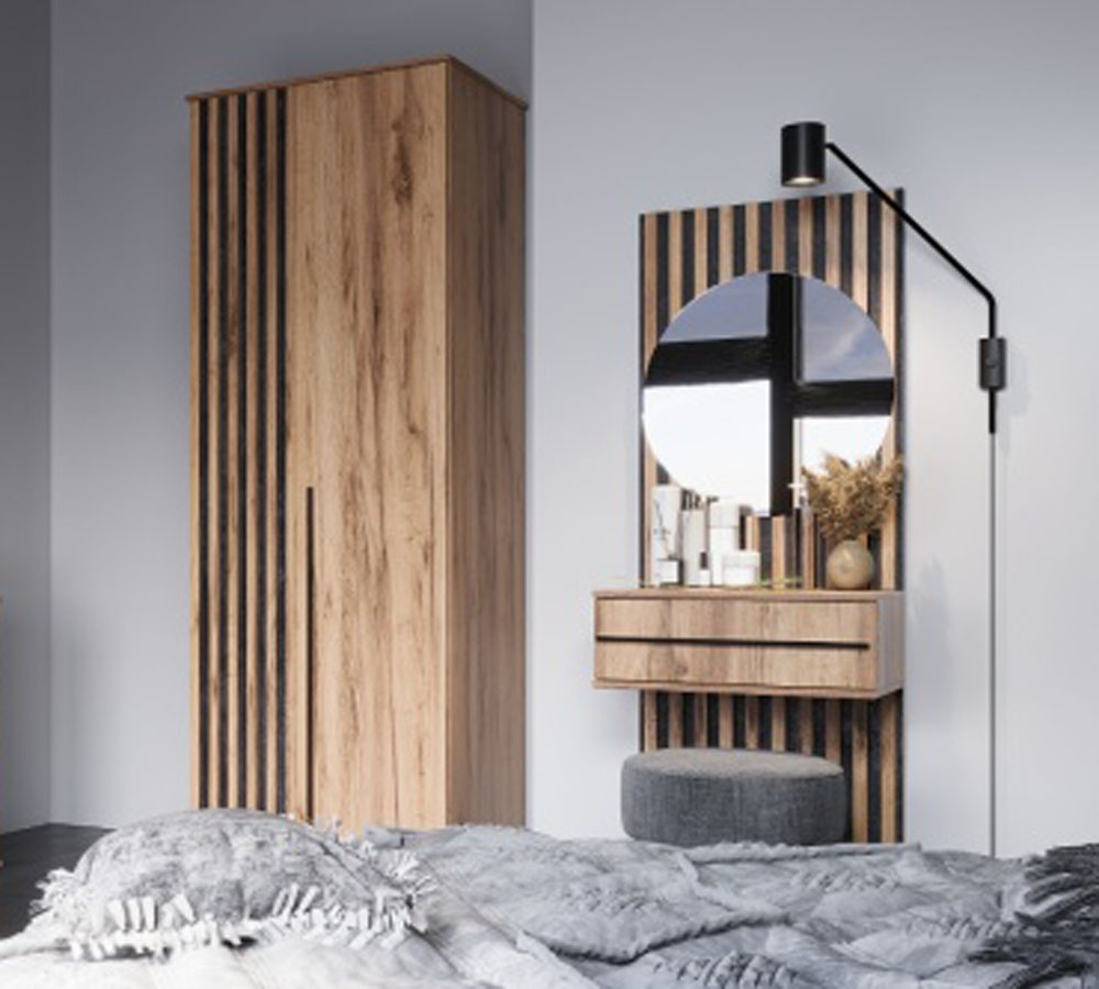 Мебельный гарнитур «Марракеш» выполнен в стиле лофт, который в последнее время все больше пользуется популярностью. Модули этого набора мебели подобранные по Вашему желанию, помогут создать неповторимую обстановку в спальной комнате.