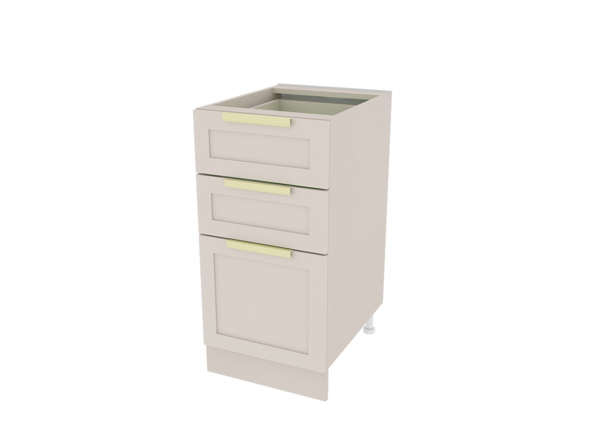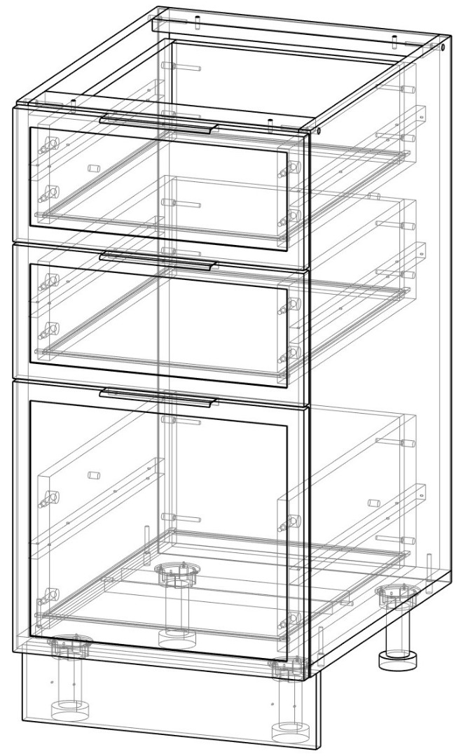 Шкаф нижний с ящиками. Ширина 400 мм. (3 выдвижных ящиках). Размеры, мм.: высота: 820 длина: 400 глубина: 520 Корпус: ЛДСП 16 мм., ДВПО (белый) Фасады: МДФ В комплекте имеется необходимая фурнитура: регулируемые ножки, шариковые направляющие (направляющие полного выдвижения), ручка и инструкция по сборке, которая позволит собрать шкаф без усилий. Количество упаковок, шт.: 1 вес, кг.: 25 объём, м: 0,052 Гарантия производителя 24 месяца столешница приобретается отдельно