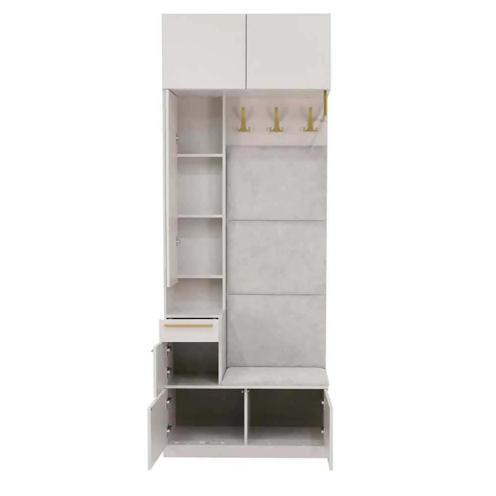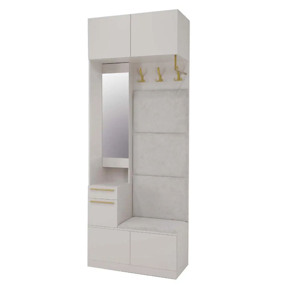 Представляем прихожую в суперсовременном цвете ЛДСП Кашемир. Модуль включает в себя элегантное зеркало с фацетом, удобный ящик для мелочей, отделения для обуви и мягкие элементы, чтобы создать идеальное пространство для вашей прихожей.