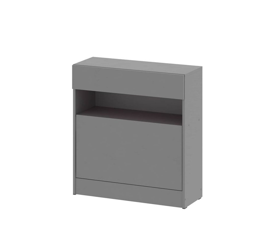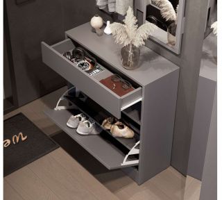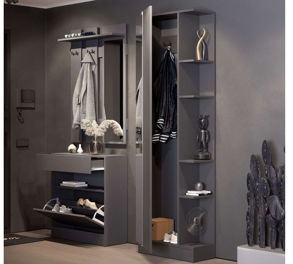 Фасад отсека обувницы вкладной внутрь корпуса. Механизм хранения обуви - веерный двухсекционный. В ней легко разместятся от 6 до 8 пар обуви больших размеров. Открытие обувницы осуществляется захватом верхней части фасада, выступающего выше полки открытой секции. Задняя стенка отсека обувницы открыта, что позволяет легко проводить уборку под ней, не перемещая сам модуль. Обувница Энни установлена на цоколь, по нижним срезам которого установлены мебельные подпятники, защищающие пол от истираний и повреждений.