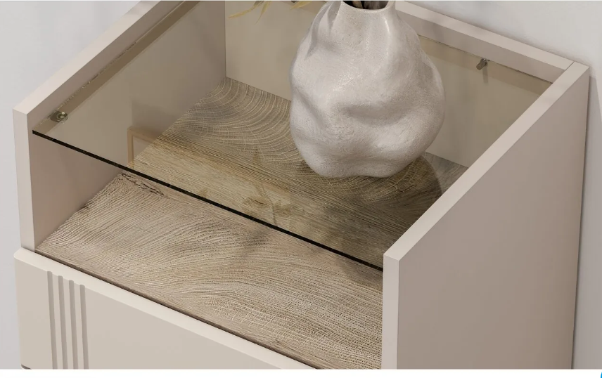 Материал корпуса: ЛДСП, цвет: Меланж/Дуб Эндгрейн/Стекло;