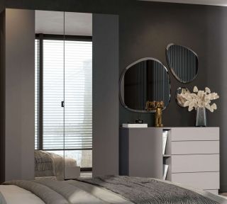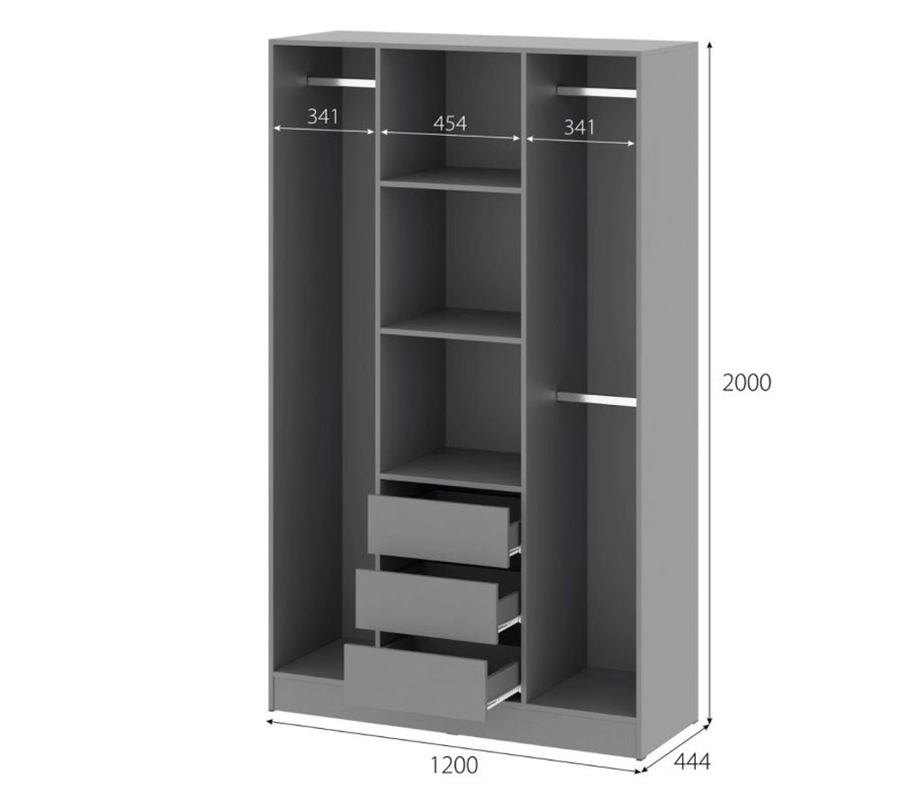 Не смотря на то, что шкаф имеет две створки, его внутреннее обустройство состоит из трех секций с тремя системами хранения. Две боковые секции предназначены для размещения одежды на штангах. Причем одна из них для длиной, а вторая для двух уровней короткой одежды. Центральная секция в верхней части оснащена полочным пространством, а в нижней - тремя выкатными ящиками.