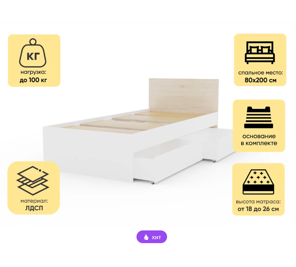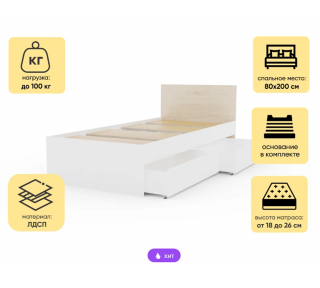 Спальное место: 800х2000 см (Матрас в комплект не входит)
