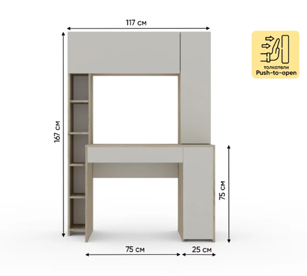 Вертикальные дверки оснащены системой push-to-open. Для открывания достаточно легкого нажатия на фасад. Закрываются аналогичным нажатием. Ручки не требуются.