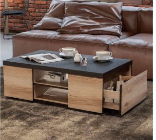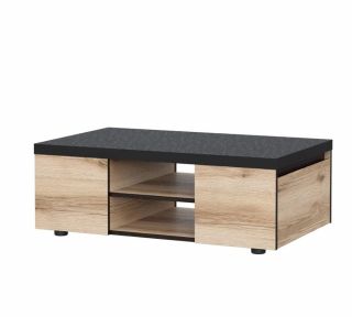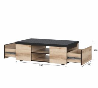 Габарит (Ш*В*Г) 950 х 339 х 580 мм. в цвете Дуб Делано/Дуб Венге. Журнальный стол "Берген" это: Два объемных и вместительных выкатных ящика на высокопрочных шариковых направляющих и открытое полочное пространство. Массивная черная столешницей толщиной 38 мм.