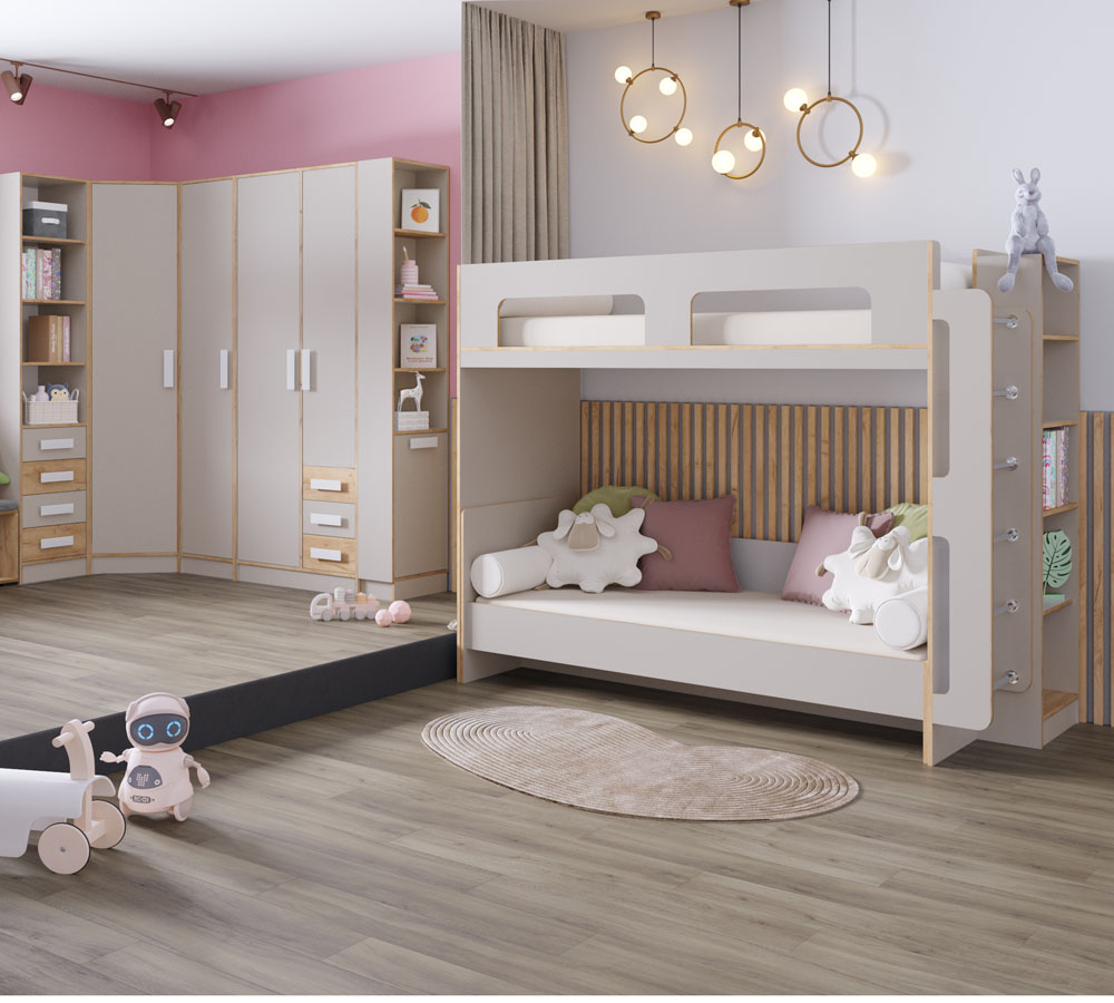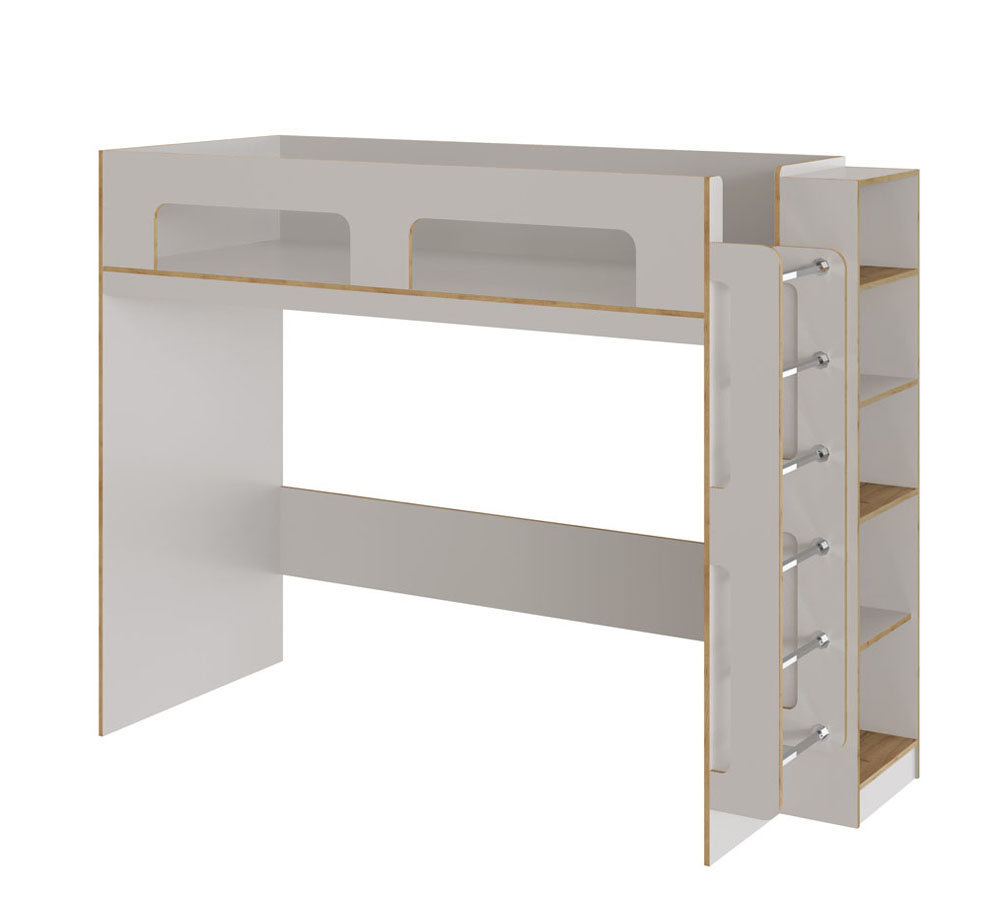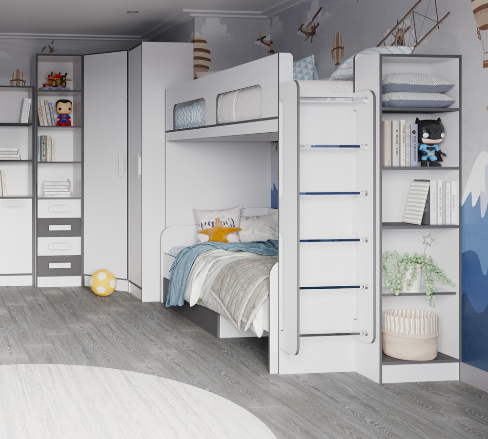 Кровать чердак спроектирована под одно спальное место и может дополняться вторым спальным местом (кровать с ящиками) или рабочим местом (шкаф малый, письменный стол).