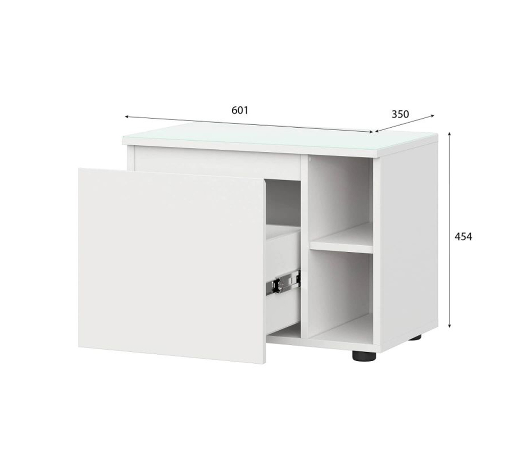 Прикроватные тумбочки, покрытые прозрачным стеклом «сатинат», также добавляют уюта в спальню. Внутри тумбочек есть выдвижной ящик на шариковых направляющих и открытые полки для хранения.